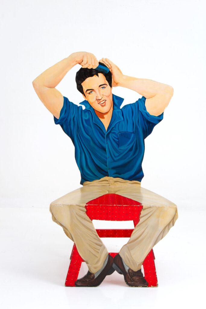 KATHY CALLAHAN © (Massachusetts, 1969) Sedia in legno dipinto raffigurante “ELVIS PRESLEY”. Firmata e datata ’94 sul retro. Difetti e segni di usura del tempo.