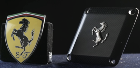 Due stemmi Ferrari, uno in metallo smaltato e l’altro brevettato realizzato in carbonio 400 euro cad